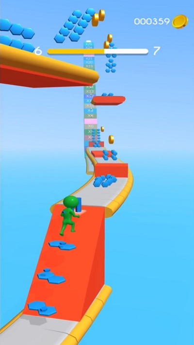 ·手指滑动控制小人左右移动,收集对应颜色的砖块,一路向前跑酷最终抵达终点