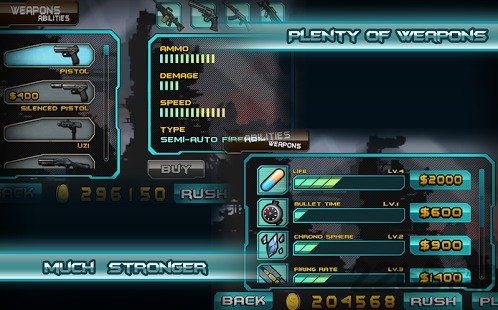 7、当你攒够钱之后可以用来购买新武器,也可以升级主角血量、弹夹容量、武器杀伤力等属性。