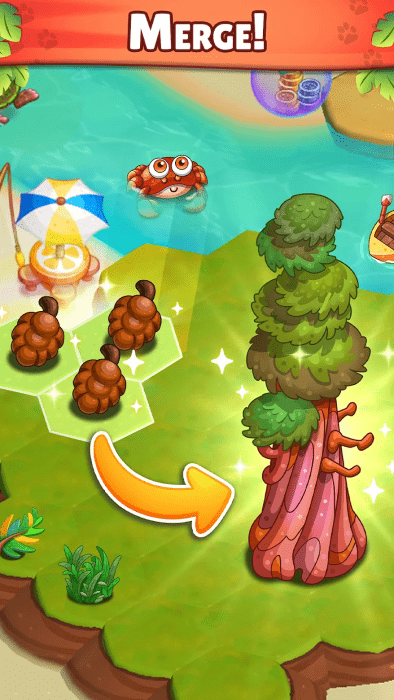合并三个或更多物品(合并次数越多,奖励越丰厚!),将它们进化成更有价值的资源或生物!