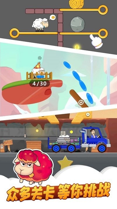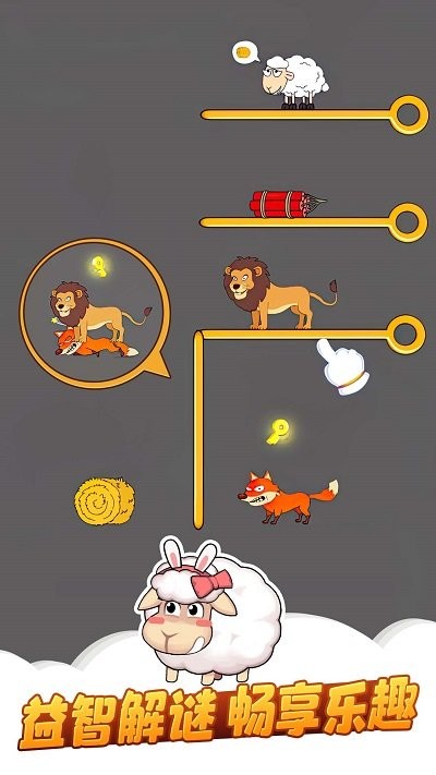 -玩法简单,有趣休闲:用手指触碰屏幕拖动游戏内的道具,解救一个个可爱的小绵羊。