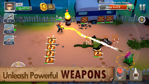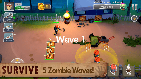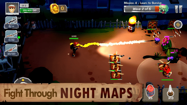 每个任务抵御5波猛烈的僵尸攻击。