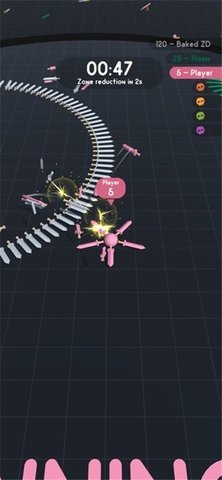 3、这款游戏的操作简单,前期通过击杀比自己的弱的对手,不断的让自己的刀片变多,你就会在游戏中变得。