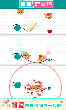 球球恋爱猫游戏是一款超甜恋爱主题的休闲闯关小游戏,你需要运用你的智慧让两个球球猫幸福相遇!规则很简单,画一条线或一个形状让小球撞在一起,你不仅需要智慧更需要一些想象力哦!是时候动动脑子啦!想办法让俩球球猫相遇吧!喜欢的朋友快来下载吧!