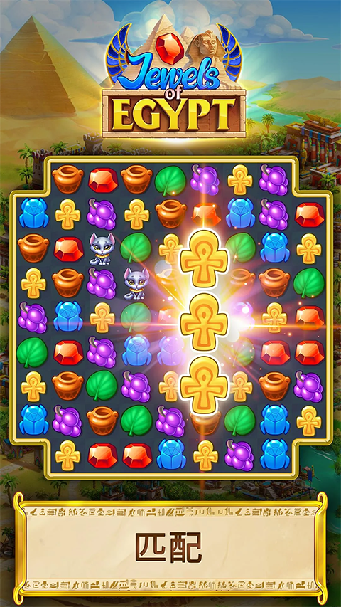 穿越回那个神秘而壮丽的古埃及时代,你将肩负起复兴文明的重任。通过匹配与交换璀璨宝石,解开一道道精心设计的三消谜题,逐步收集木材、石材、黄金等关键资源。随着关卡推进,你将亲眼见证尼罗河畔的宏伟建筑在你手中拔地而起,重现昔日荣光。