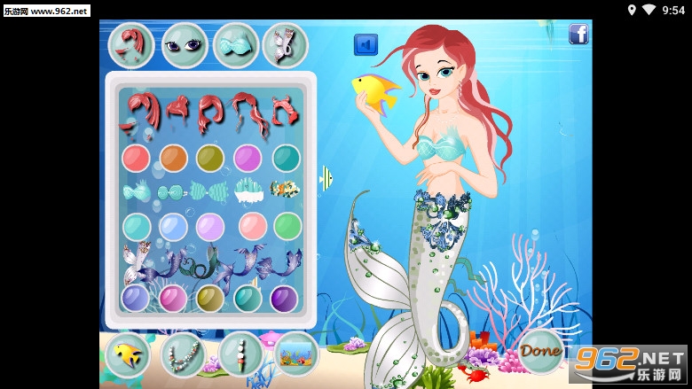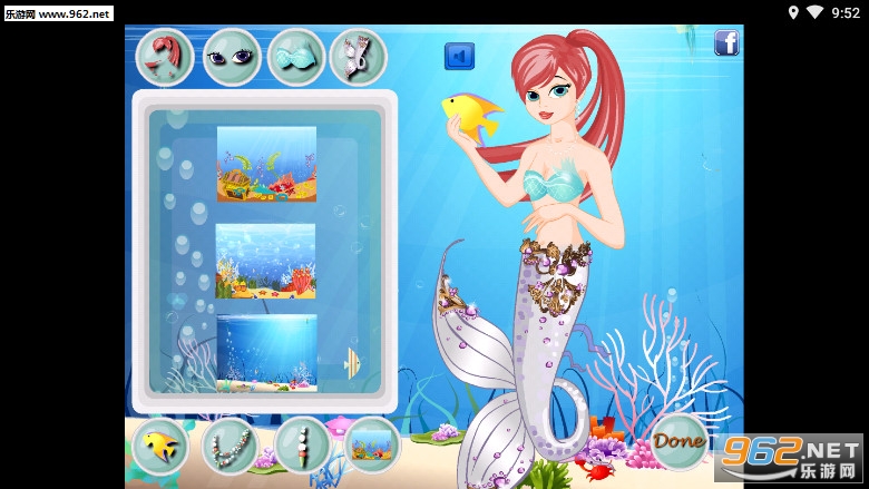 1.触摸点击选择衣服、耳环、头饰等,可以改变人鱼公主的装扮