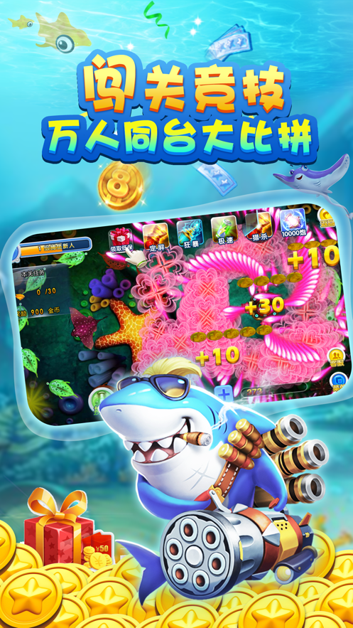 1.发射炮弹捕捉鱼类,获得金币奖励。