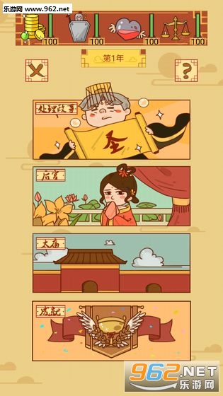 趣味的养成游戏,玩家将成为一位皇帝治理自己的国家,提高国库的库银、提高军队武力、提高体力,当然你还要得民心,喜欢的朋友可以下载试试。