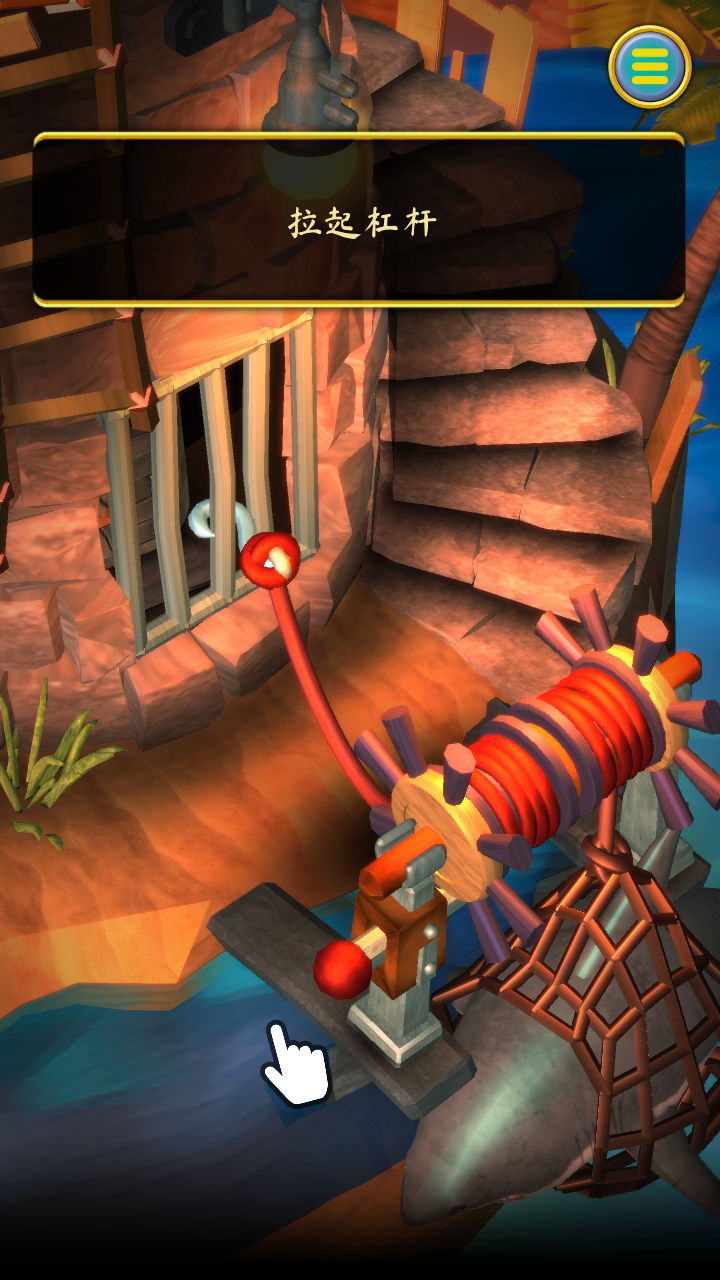 4、例如,需先放下上方巨石砸毁木船,再用钩子拉开铁窗。