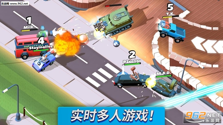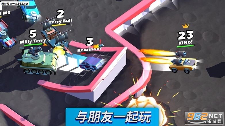 《疯狂撞车王(Crash of Cars)》是一款风格轻松休闲、玩法简单易上手并且崇尚快速匹配的多人竞技手游。游戏中我们要驾驶自己的战车闯入竞技场,与同样降临这片战场的对手们周旋、拼杀。除了冲撞,《疯狂撞车王》还为我们准备了非常丰富的击杀手段。你可以拾取地上的道具箱,用尖刺、火炮、导弹、雪球甚至是地形来消灭你的敌人。