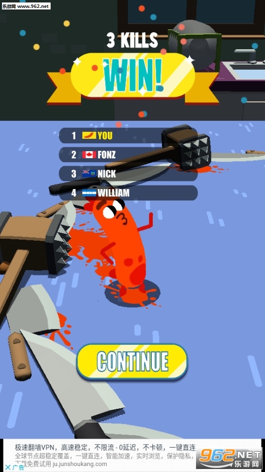 游戏当中,我们需要操纵自己的香肠移动,当停下来时,他的头就会因为重力被甩出去,我们用这个时间来攻击对手,将敌人打下弄死,你把越多的敌人推下去,体型也会越来越大,可以推的距离也越来越远,当然,体型越大不代表你就越强,只要合理的利用好地形,也可以很轻松的弄死对手,不过我还是很喜欢把他们一个推下悬崖,看着他们的绝望的掉下去,真的是不要太舒服,当然,玩多了也会审美疲劳,所以一定要注意,玩游戏的时间,不要玩过头了。