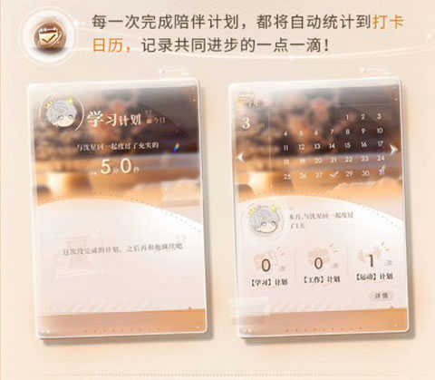 陪伴奖励机制:每一次完成陪伴计划,系统都会自动记录打卡数据,并生成专属日历,见证你们共同成长的点滴。坚持陪伴,收获的不仅是亲密值,更是双向奔赴的温暖回忆。