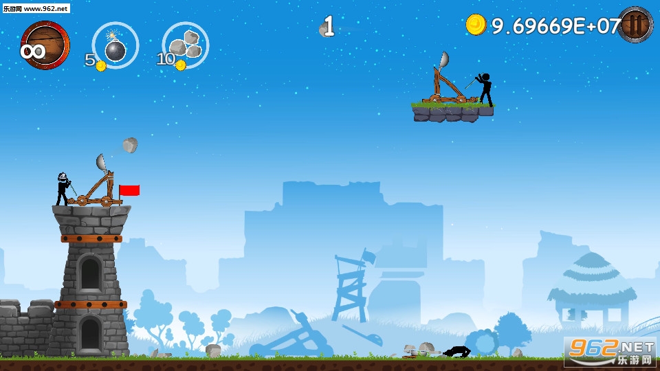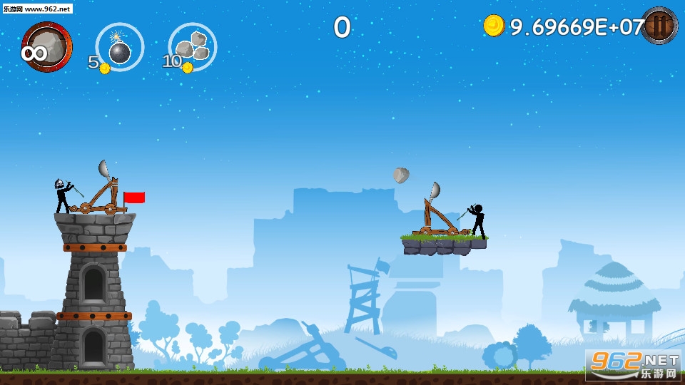 《投石机射手安卓版》这是一款以火柴人对战为主题的物理投掷类休闲闯关手游,游戏画面十分的简单,游戏中,玩家需要利用投石机不断的打击对手,注意力度和角度的把控,以最少的投掷次数将对手成功击毙,感受物理投掷带来的欢乐对战乐趣。