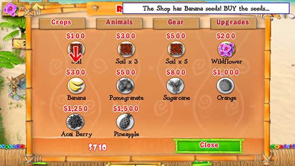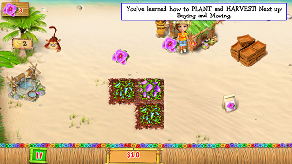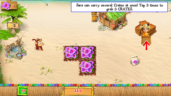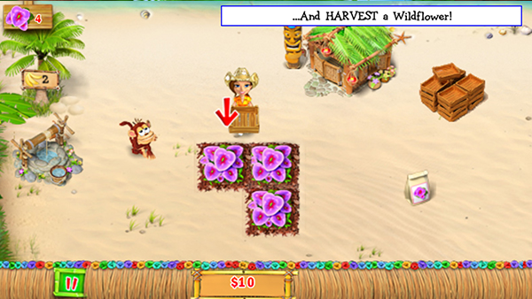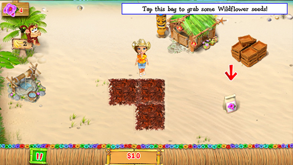 每个关卡都有明确目标,例如在1分30秒内收获4朵鲜花,成功即可获得700金币奖励。操作简单直观:先点击角色移动至红色箭头位置拾取种子,再前往红土地进行播种,确保每块土地都种满作物。