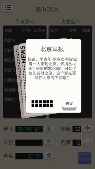 北漂浮生记手游安卓版是一款融合现实生存压力与黑色幽默的高自由度模拟经营游戏。你将从身无分文的北漂青年起步,通过低买高卖、资产配置、势力扩张甚至灰色交易,在北京这座机遇与风险并存的城市中杀出一条生路。商品行情瞬息万变,随机事件层出不穷——可能一夜暴富,也可能街头挂彩;既能租房换铺、组建团队,也可能因倒卖非法货品而声名狼藉。在这里,每一分钱都来之不易,每一次选择都关乎命运。这不仅是一场财富积累的冒险,更是一次对现实社会规则与人性抉择的深度体验。