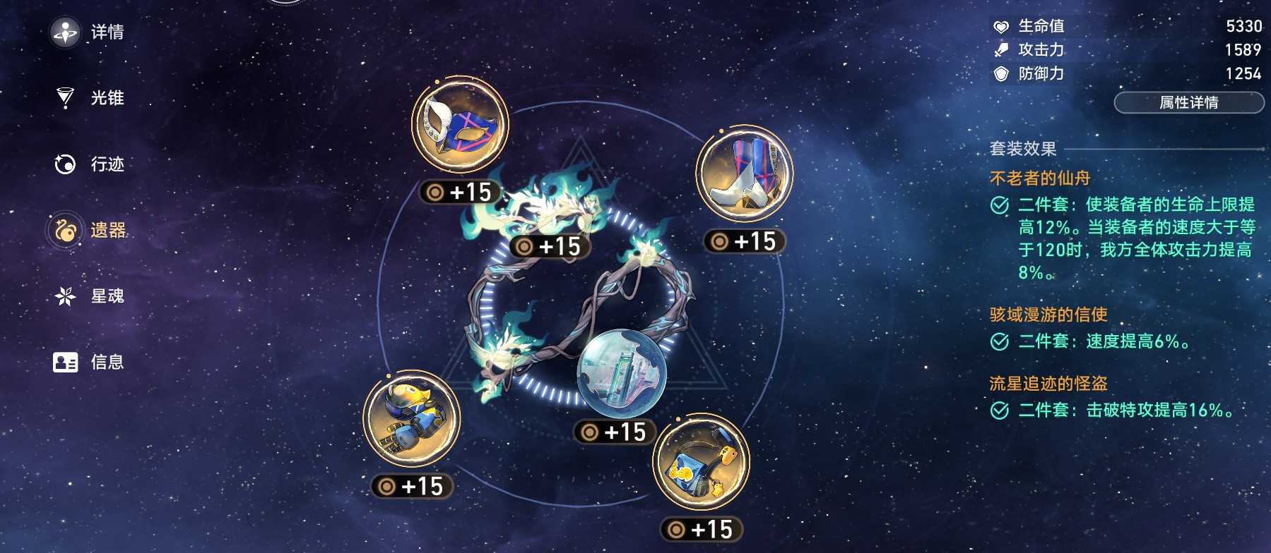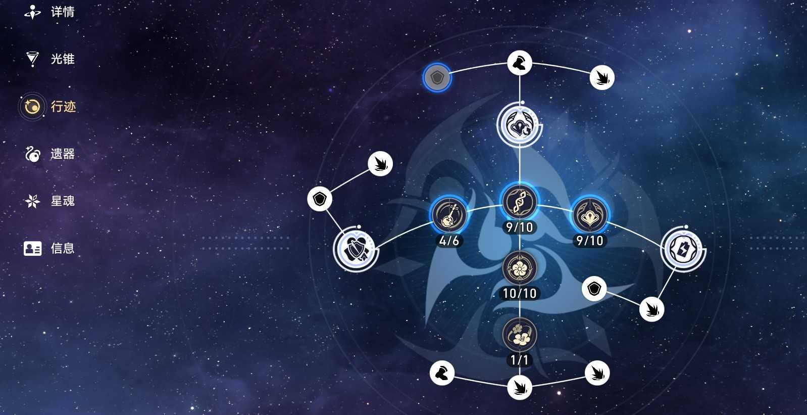 行迹系统需消耗材料升级技能,主力输出建议关键技能点满至10级;辅助则优先强化核心技能至满级,其余技能达8级以上即可视为毕业。遗器系统为后期养成重点,六部位套装分泛用与专用两类,合理搭配可最大化战力提升。