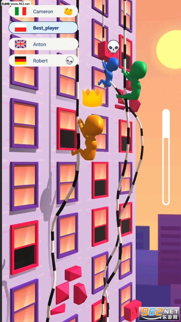 目的的生存类游戏,他模仿人类一败涂地引擎,在人物控制上非常不轻松,而且容易产生魔性行为。但就是这么不轻松,还让你往上爬,一旦没掌握好节奏就会掉下去。与人类一败涂地相似的地方是他可以影响队友或者敌人,恶搞他们,让他们从绳子上掉下去。