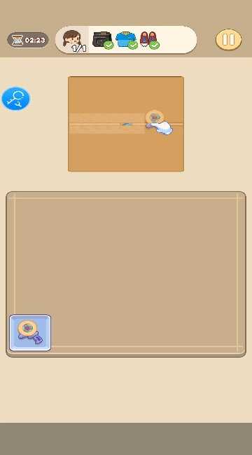 4、最后使用左下角的封箱胶带完成密封,即可顺利通过首个关卡挑战。