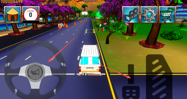 2、驾驶过程中通过左侧虚拟摇杆控制方向,右侧功能区集成油门、刹车与手刹按钮实现精准操控;