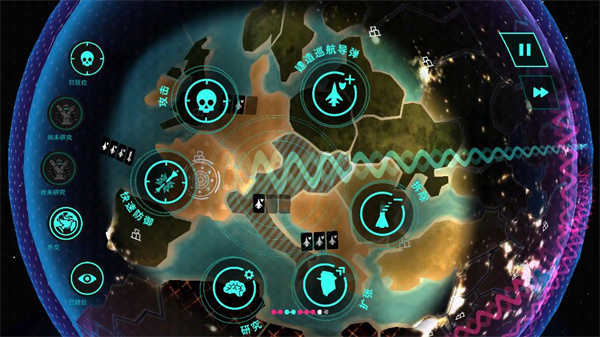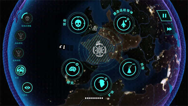 4、放大视图,点击地球上的其余势力,玩家可以选择直接攻击、研究、扩张拆除以及建造导弹等操作;