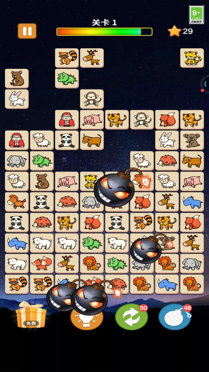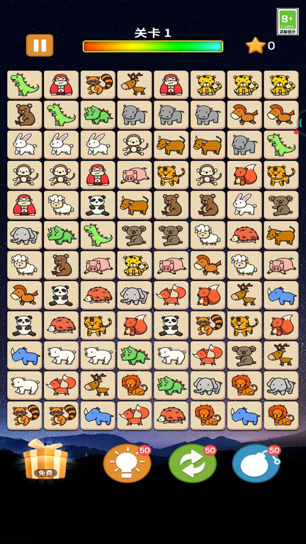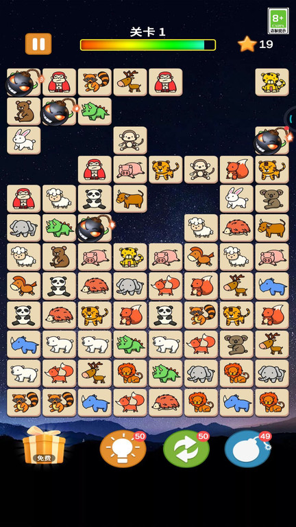 经典的休闲免费连连看消除游戏,简约的画风,画风中的萌宠,点击图案相同的两个小动物即可将它们消除,在规定时间内将游戏中的动物消除完,即可通关。