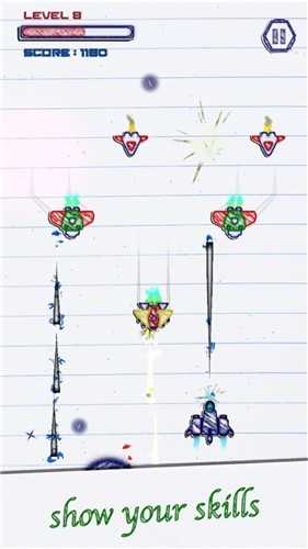 【纸上战斗】纸上战斗是一款采用手绘画风打造的休闲游戏,游戏以空战射击玩法为主,玩家将操控战机在纸面上飞行,与敌人战斗,敌人的火力非常猛,只有保持移动,才能避免被敌人击中,游戏的画面非常独特,玩法也非常有趣,有多种不同的战机可供玩家解锁,玩家可以使用资源升级战机,提升战机的防御能力,让战机能够承受住敌人的攻击。