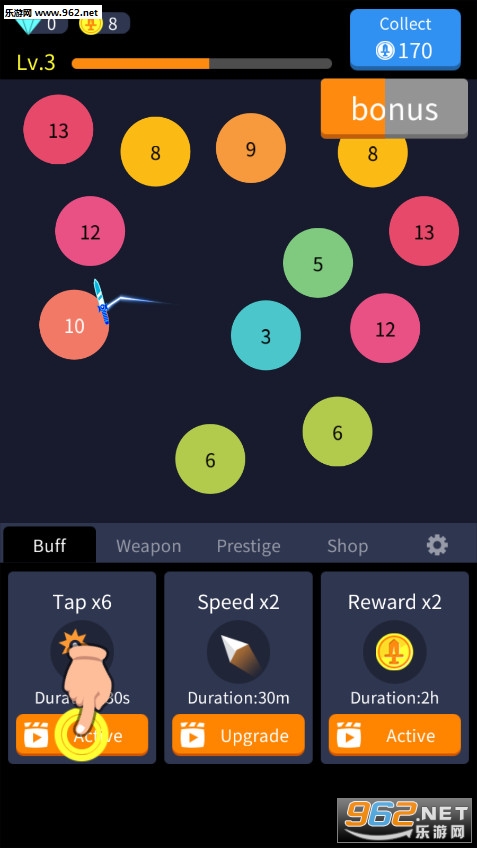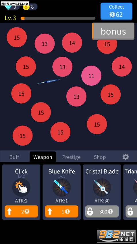 《放置利刃手游》是一款非常打发时间的休闲弹射游戏,游戏中玩家要使用飞刀利用弹射去戳刺那些数字小圆球,圆球上的数字表示需要被击中的次数,玩家可以使用金币去解锁不同的飞刀,每种飞刀的伤害值也是不一样的,还可以去升级它们。