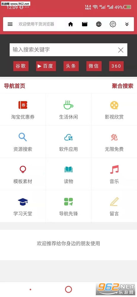 干货浏览器聚合了多项资源搜索引擎,可以解析视频、看小说、漫画、下载全网音乐、百度网盘下载不限速、全民k歌歌曲免费导出等!