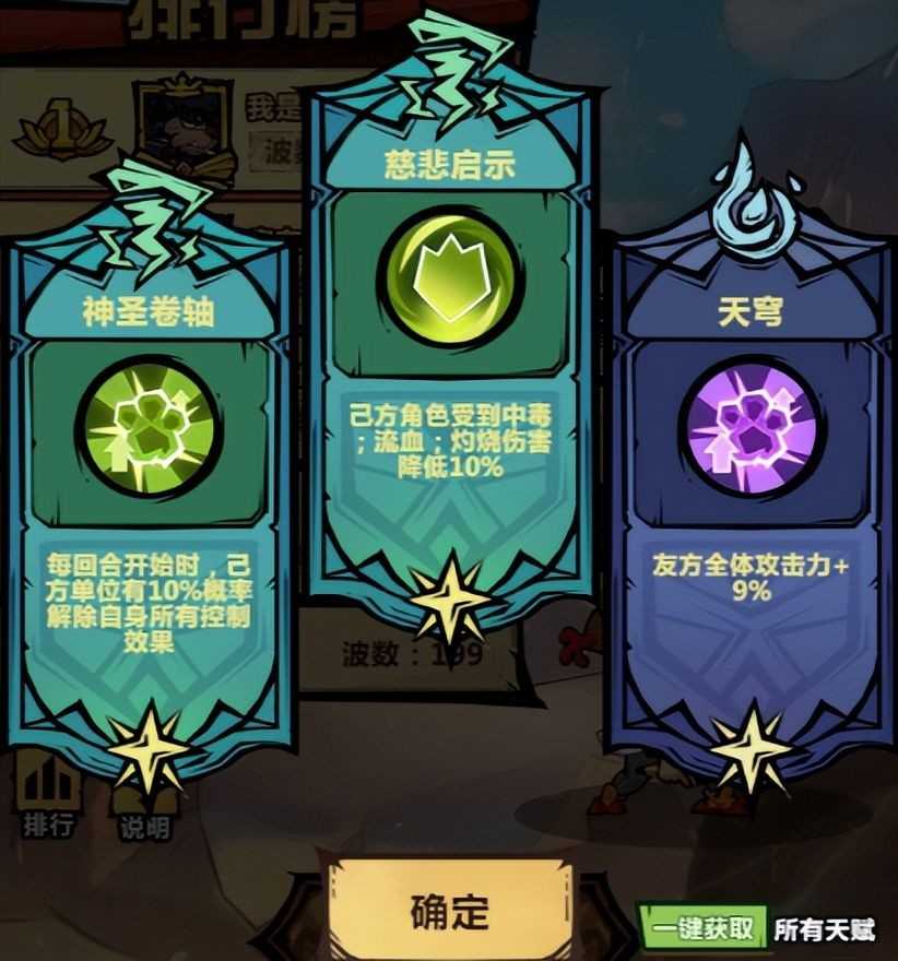 在峡谷守卫战中,每成功守卫10波敌人,即可从随机天赋中选择一项增益效果。天赋分为绿、蓝、橙三档品质,同名天赋不可叠加。根据实战效果,推荐优先级如下:第一档(必选)包括全体攻击力提升、全体减伤提升、全体防御提升;第二档(优选)涵盖降低敌方BUFF效果、全体精准度提升、每回合提供护盾、释放技能概率获得能量;第三档(次选)则为全体暴击几率提升与每回合解控。合理规划天赋路线,能极大提升续航与输出能力。