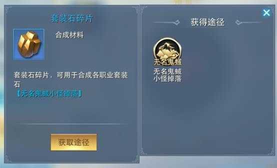合成各个职业的套装石需要集齐一定数量的套装石碎片,套装石碎片可从无名鬼蜮小怪掉落。