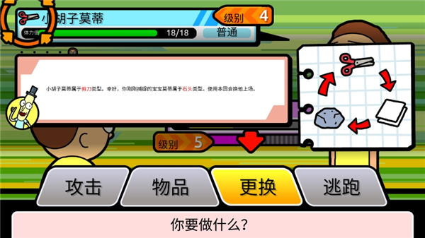 8、继续往前走,还会碰到其他的挑战,不同的莫蒂有不同的类型,比如说小胡子莫蒂属于剪刀类型,刚刚捕捉的莫蒂属于石头类型,因此本局需要进行更换莫蒂,点击【更换】;
