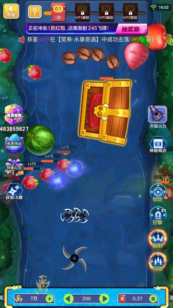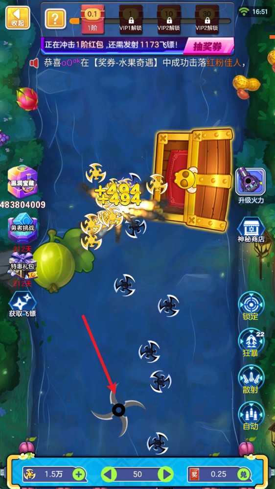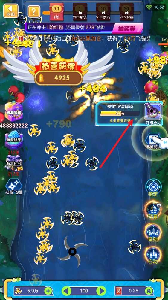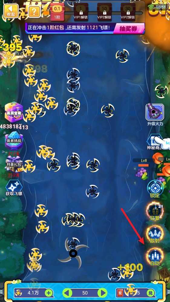 点击右下角功能按钮,可开启自动射击模式,并激活散射、狂暴等强力增益效果,大幅提升输出效率。