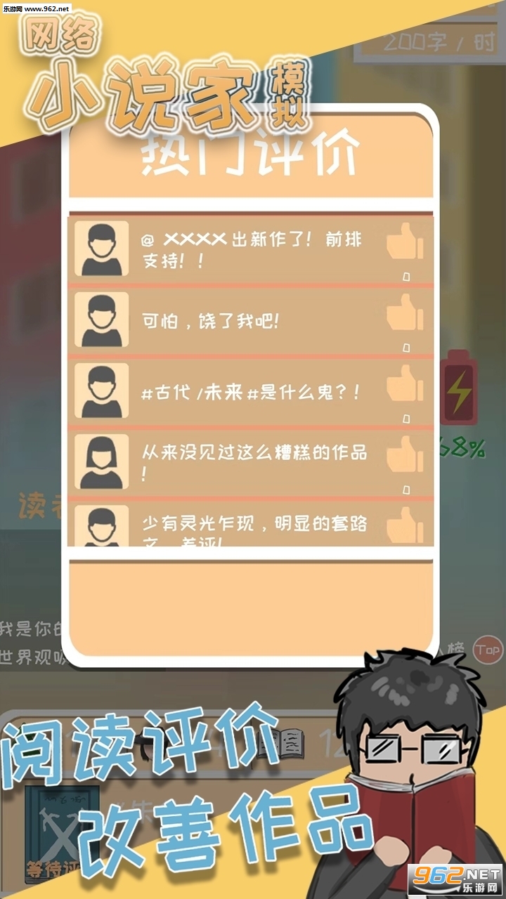 《网络小说家模拟》是一款卡通风格的职业模拟器,游戏中玩家将成为一名网络小说家,不断的通过发表自己的网络小说来养活自己,当然前期还是需要靠打工来维持生活,游戏的玩法丰富有趣,只是后期的内容有所不足,赶快下载体验吧!