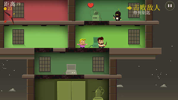 游戏让大家体验到了只需一手操控也能感受猛烈撞击的快感,刚开始贴心的新手教程也足矣让玩家一目了然,只需上下滑动屏幕,便可操控这位大胡子上下跳跃来回穿梭撞击在各个楼层之间,并在躲避敌人的攻击同时攻击敌方解救人类。