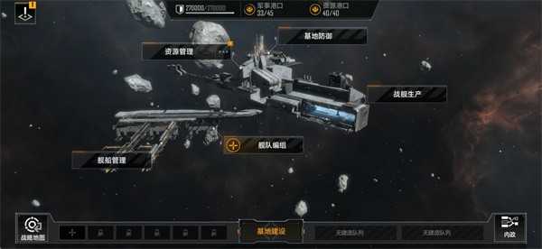 进入游戏后,点击主界面左下方即可进入个人基地。这里是您整个星际事业的核心枢纽,支持战舰生产、舰队编组、资源管理、设施升级、基地防御及星际交易等关键操作,是维系生存与扩张的战略中枢。