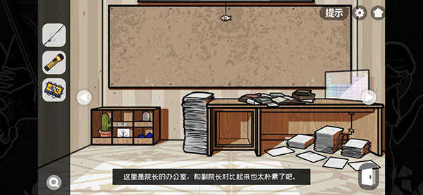 依次使用线索6与线索7打开柜门和保险箱,取得门禁卡与损坏磁带。持门禁卡进入院长办公室,用鱼竿钩下投影屏,并在各处搜集四张铭牌(含柜中一张)。