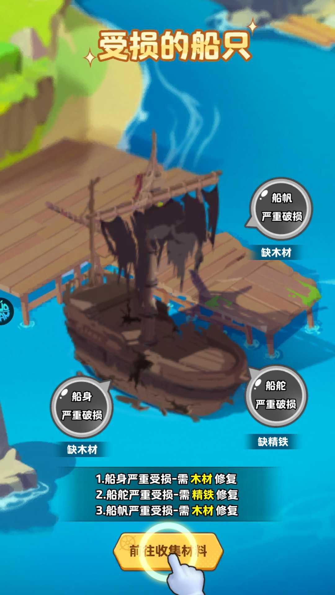 进入游戏后,首先建造基础建筑,并点击场景中的破损船只,启动你的航海征程。