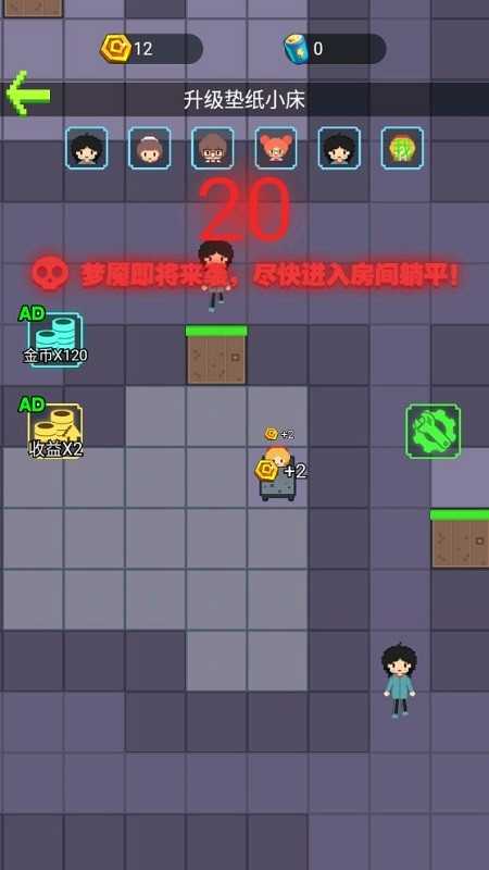 求生大冒险三人模式是一款融合策略、合作与紧张刺激的经典躺平塔防手游。在一间布满危机的房子里,至少配备三张床,三位玩家将并肩作战——有人专注发育经济,有人负责建造防线,还有人灵活应对突发状况。随着时间推移,猛鬼会越来越强大,而你们必须通过升级门锁、搭建防御塔、布置陷阱和收集强力装备,共同守护最后的安全区。这款游戏不仅考验个人策略思维,更强调团队默契,是好友开黑、共度惊险夜晚的绝佳选择!