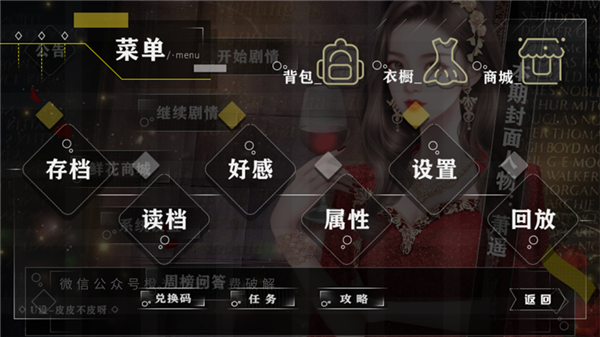 2、接下来我们可以点击右上角的菜单功能,然后选择存档、读档、好感、属性、设置、回放等多个功能。