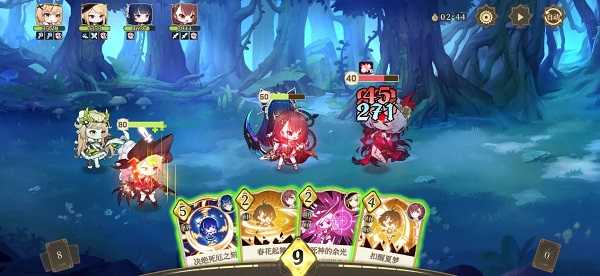游戏采用独特的即时卡牌+回合策略”混合战斗机制。每场战斗可上阵4名乐姬,每位拥有3张专属技能卡,共12张组成动态牌库。战斗开始时抽取4张手牌,使用后自动从牌库补牌,配合圣物与技能效果,还能改变起手数量或插入衍生卡,带来高度自由的战术组合。
