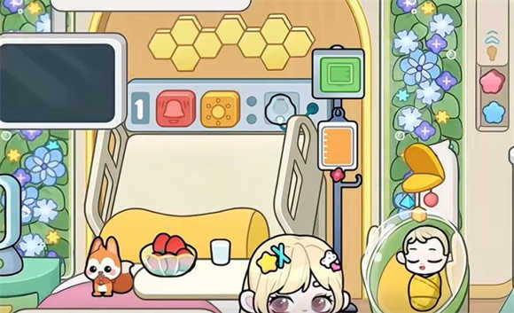 3、来到医院二楼,将小宝宝放入婴儿箱中会获得一把钥匙,然后将钥匙放入旁边墙上的钥匙孔中可以解锁两个按钮,使用这两个按钮可以改变房间的装饰。