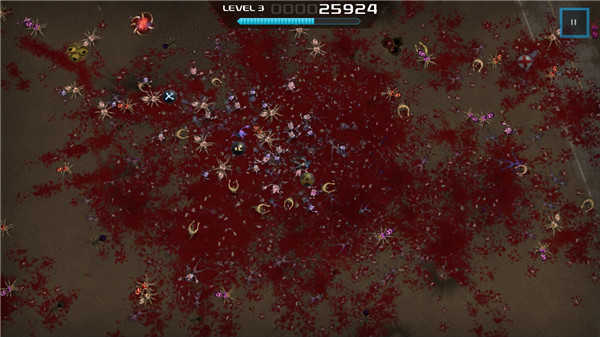 1、画面:游戏是2D画面以俯瞰视角进行的射击游戏,画面效果绚丽,战斗也体现了血流成河”的场面,美中不足的是角色体积较小,但是在也正因为如此游戏战场范围比较广阔,敌人一波波的袭击使整个战斗非常有气势。