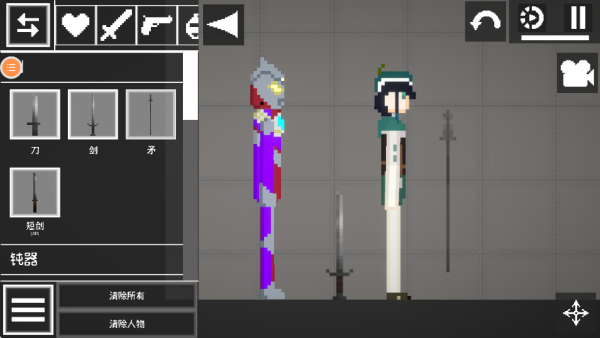 3.玩家可从角色库中调用不同属性的虚拟角色,同时从武器库选取冷兵器、投掷物、魔法道具等装备进行配置。