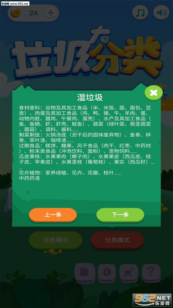 1、游戏有两种模式玩法,任务模式、分类模式,在做任务的过程中慢慢熟悉垃圾分类规则;