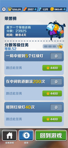 任务列表显示在游戏启动界面的主界面上,可以在游戏进行前在屏幕左上方领取任务,也可以在游戏进行时点击暂停按钮进入任务列表,暂停按钮同样出现在屏幕左上方。任务要求包括收集500枚金币”赢得1000分”等,当任务完成时主屏幕会出现提示。