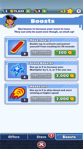 2、商店可购买技能和道具。玩家们在游戏中会收集众多金币,可以利用这些金币到游戏商店中购买技能和道具,道具主要有加速、磁铁、滑板等。