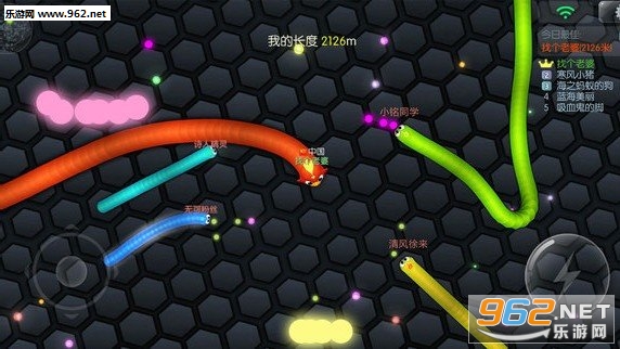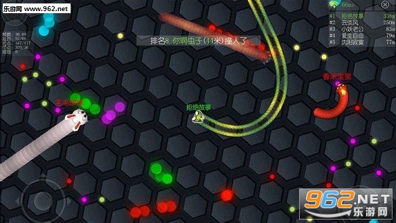 2、你将和几十个玩家争夺食物,简单的游戏规则,当头部碰到其他虫身体和墙壁时,它就会死亡。