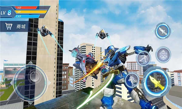 游戏构建了一个庞大而真实的科幻世界观,玩家操控的机甲具备多形态变形能力。在陆地上,它是高度拟真的战斗机器人,可在模拟城市中自由行走;潜入水中,则瞬间化身为3D机械鲨鱼,畅游深海;升空后还能变形成战斗机,实现海陆空三栖作战。