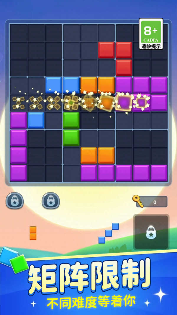 随着关卡深入,方块下落速度会逐步加快,考验你的反应力与空间规划能力。掌握预判落点、预留空位、构建平整堆叠等技巧,是高效通关的关键。每一局都是全新的挑战,每一次消除都充满即时反馈的爽感。