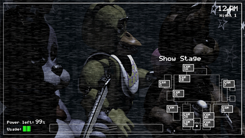 值得注意的是,玩偶的出现频率与行进路线并非固定,充满随机性。当Chica或Freddy从正门进入室内,或Bonnie出现在通风口时,立即戴上面具”并保持静止,它们通常会在短暂停留后自行离开。整个夜晚,你必须在监控、上发条、开关门窗与佩戴面具之间高效切换,才能熬过这漫长而致命的五夜。