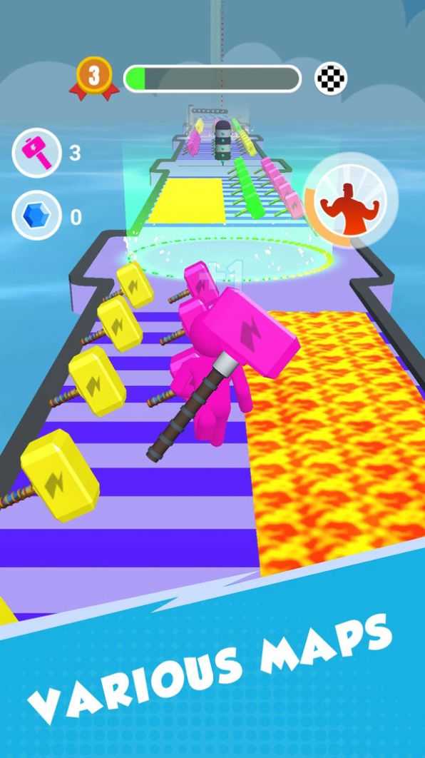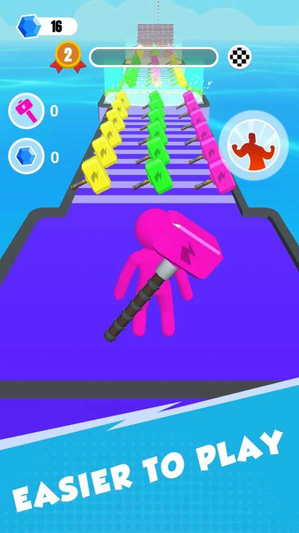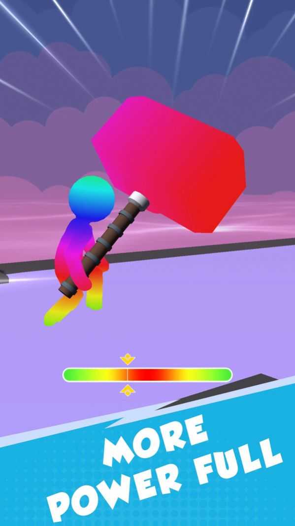 游戏玩法直观易懂:控制角色沿赛道前进,沿途拾取小锤子不断壮大你的武器体积。锤子越大,终点测力机打出的分数就越高!同时,合理使用商城中购买的强力道具(如加速、磁吸、护盾等),能助你突破难关、冲击排行榜巅峰。